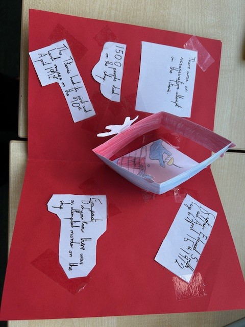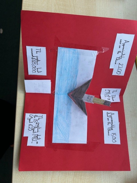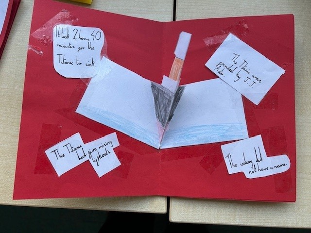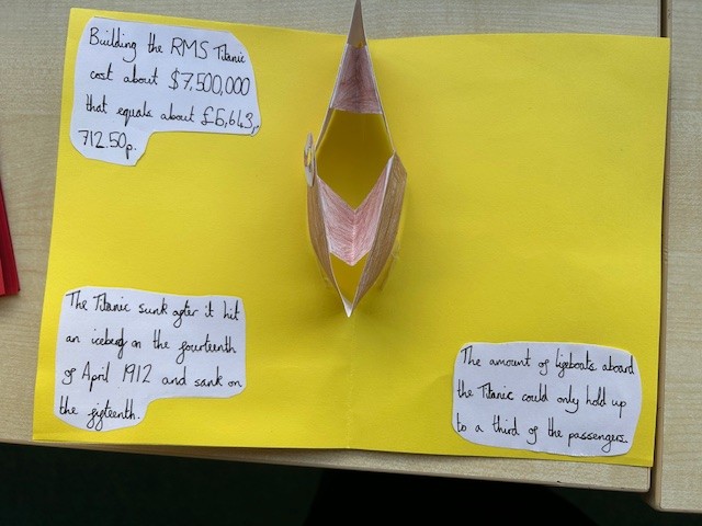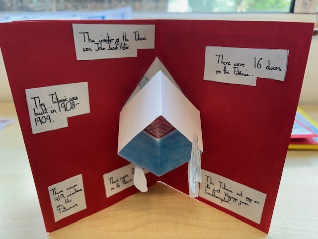 After researching different methods of folding and opening, the Year 5 children have been designing and making their own Titanic books using 2 different methods for creating the 'Pop Up'. The outcomes are impressive!